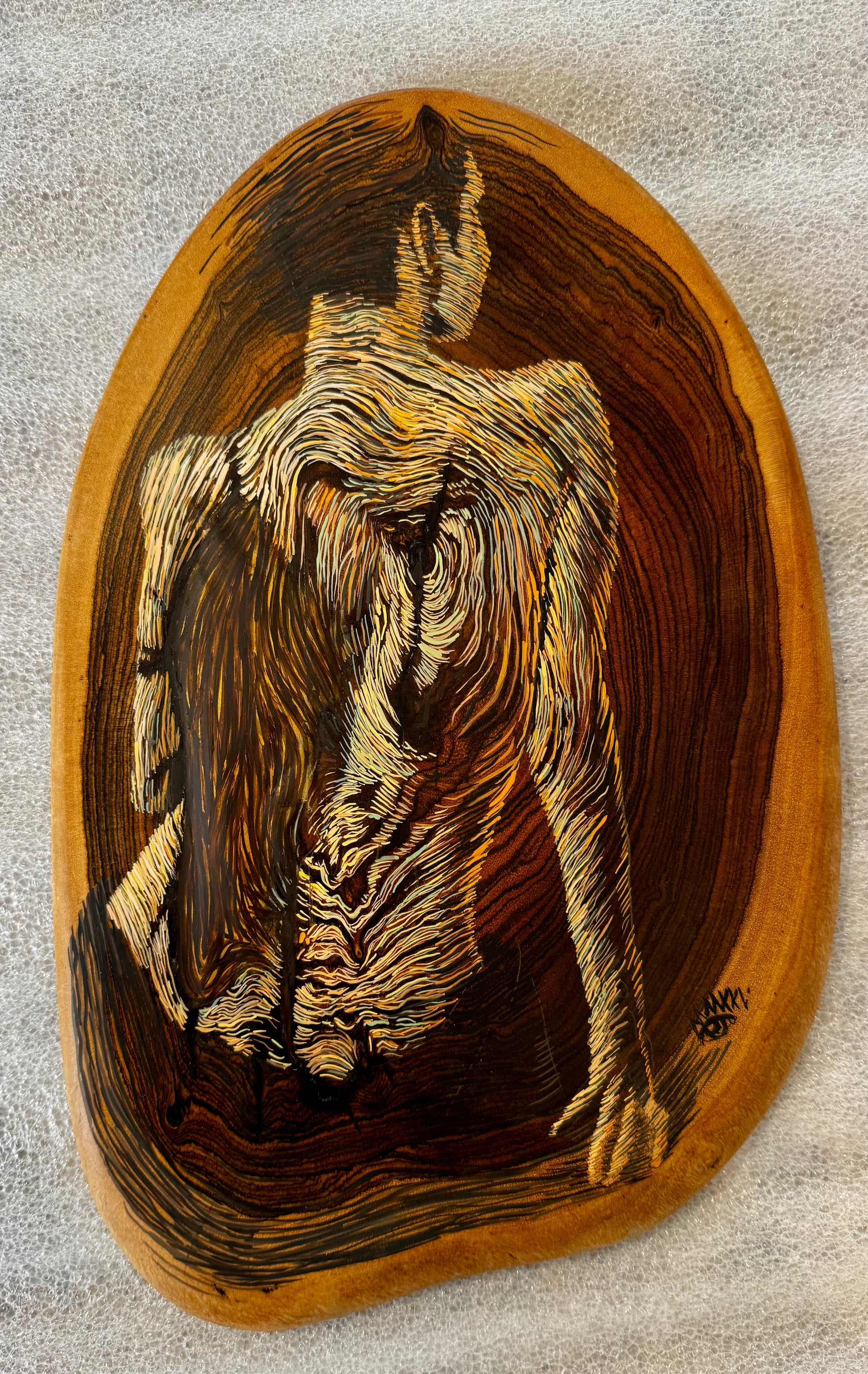 Esta obra es un óleo sobre madera finamente detallada para pintar las vetas con materiales de primera calidad. Este trabajo es finamente tratado para lograr extraer de este patrón establecido por la naturaleza una figura humana.