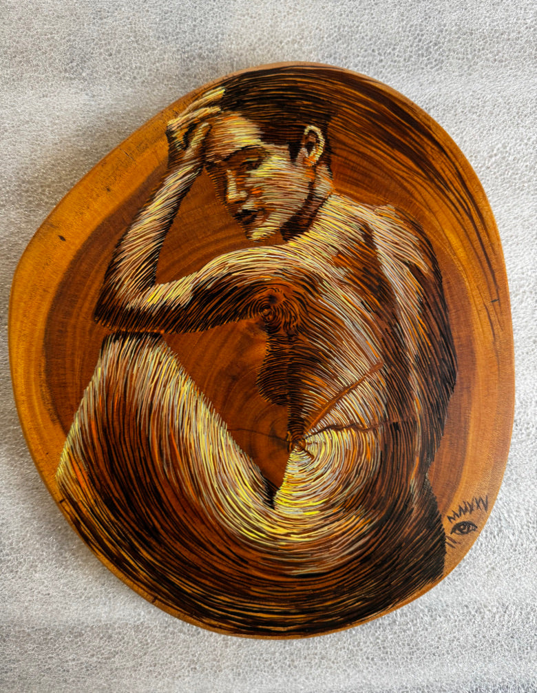 Esta obra es un óleo sobre madera finamente detallada para pintar las vetas con materiales de primera calidad. Este trabajo es finamente tratado para lograr extraer de este patrón establecido por la naturaleza una figura humana.