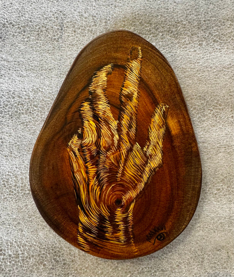 Esta obra es un óleo sobre madera finamente detallada para pintar las vetas con materiales de primera calidad. Este trabajo es finamente tratado para lograr extraer de este patrón establecido por la naturaleza una figura humana.