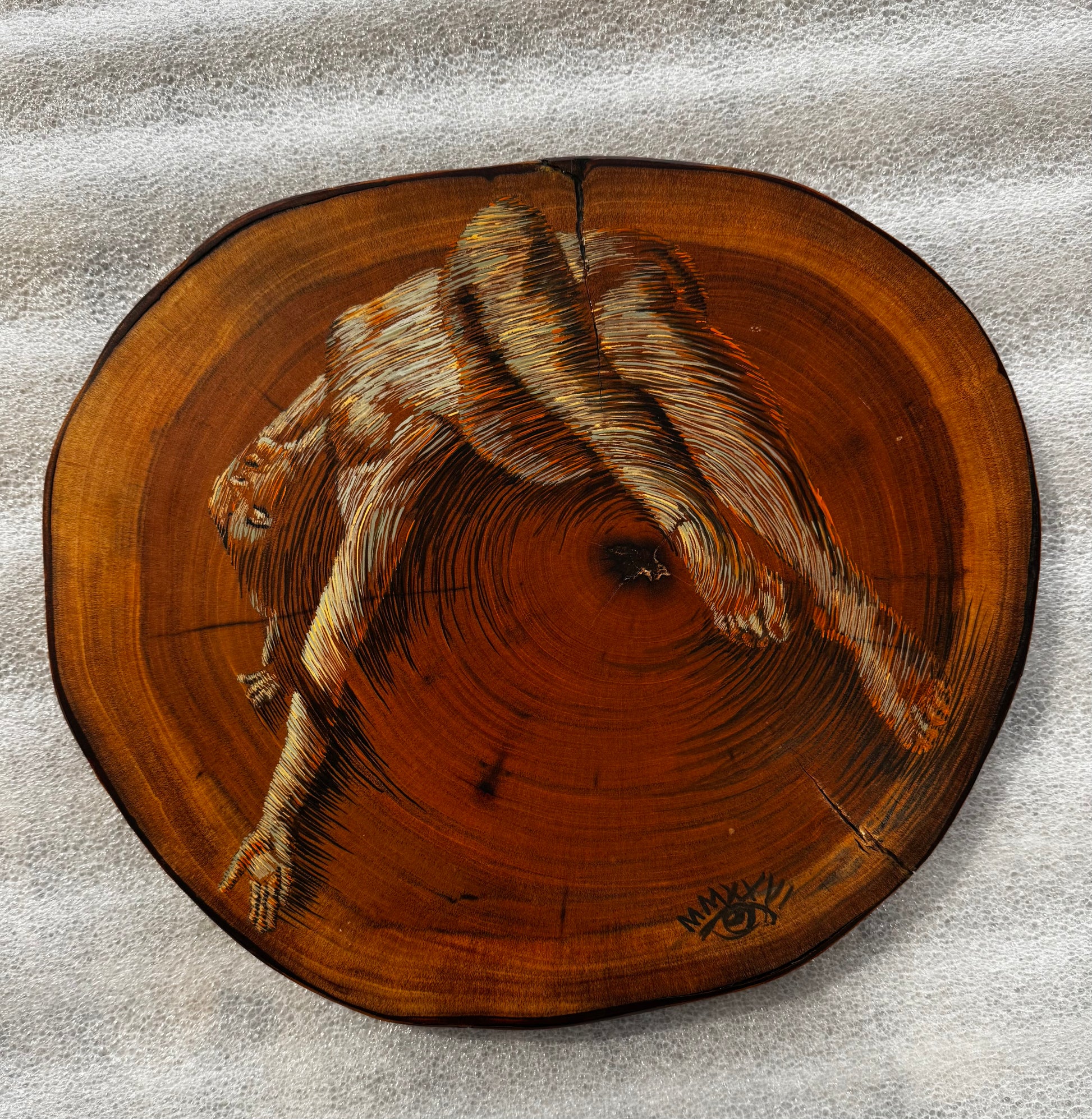 Esta obra es un óleo sobre madera finamente detallada para pintar las vetas con materiales de primera calidad. Este trabajo es finamente tratado para lograr extraer de este patrón establecido por la naturaleza una figura humana.