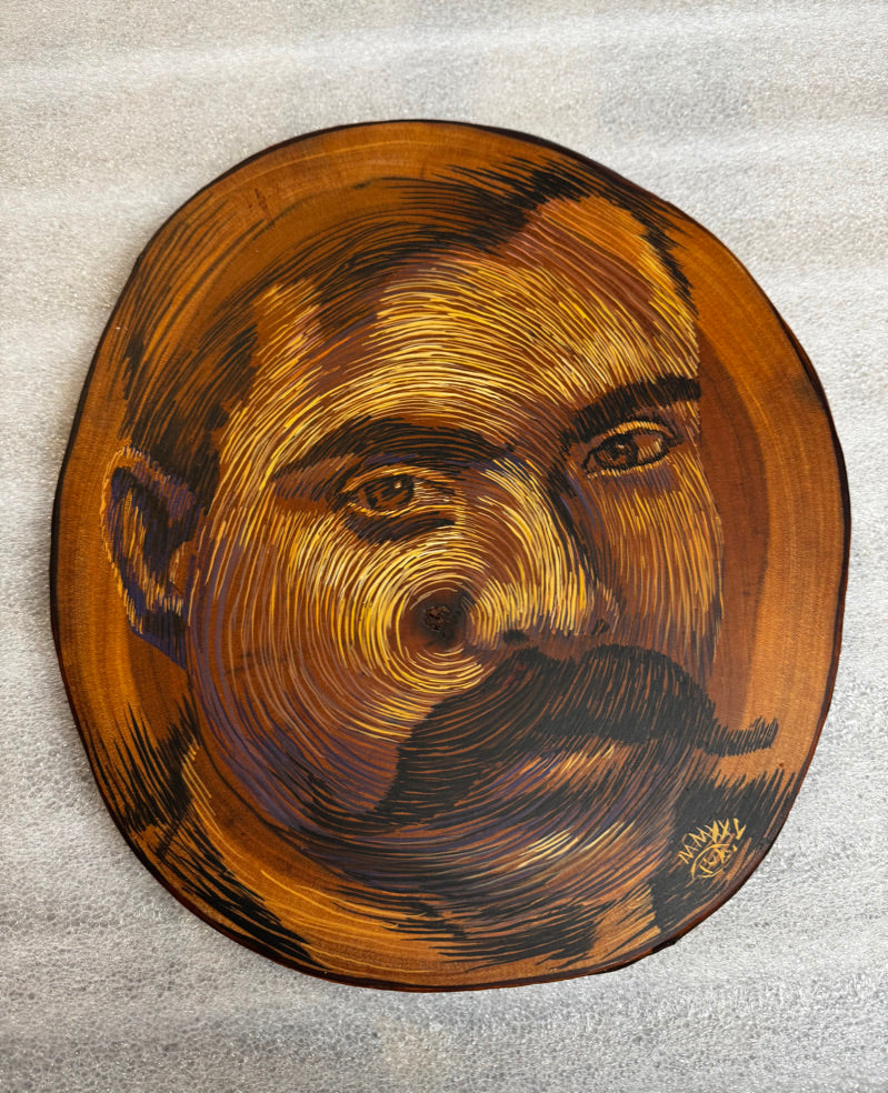 Esta obra es un óleo sobre madera finamente detallada para pintar las vetas con materiales de primera calidad. Este trabajo es finamente tratado para lograr extraer de este patrón establecido por la naturaleza una figura humana.